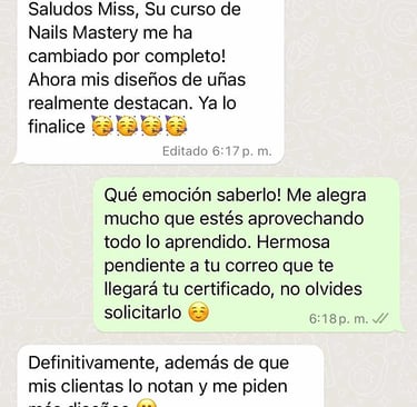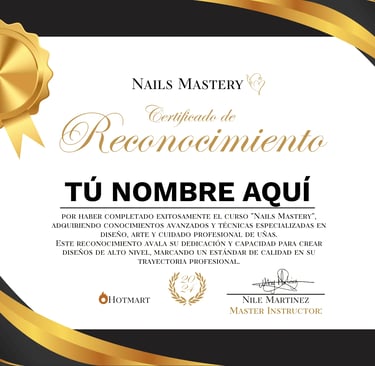Hoy, con orgullo, comparto mis conocimientos a través de un curso 100% online, diseñado para quienes, como yo, sueñan con hacer del nail art más que un hobby: una fuente de ingresos estable y una carrera llena de creatividad. Mi misión es demostrar que, con la formación adecuada y la mentalidad correcta, cualquier persona puede convertir su pasión en un éxito. ¿Estás listo para comenzar tu transformación?