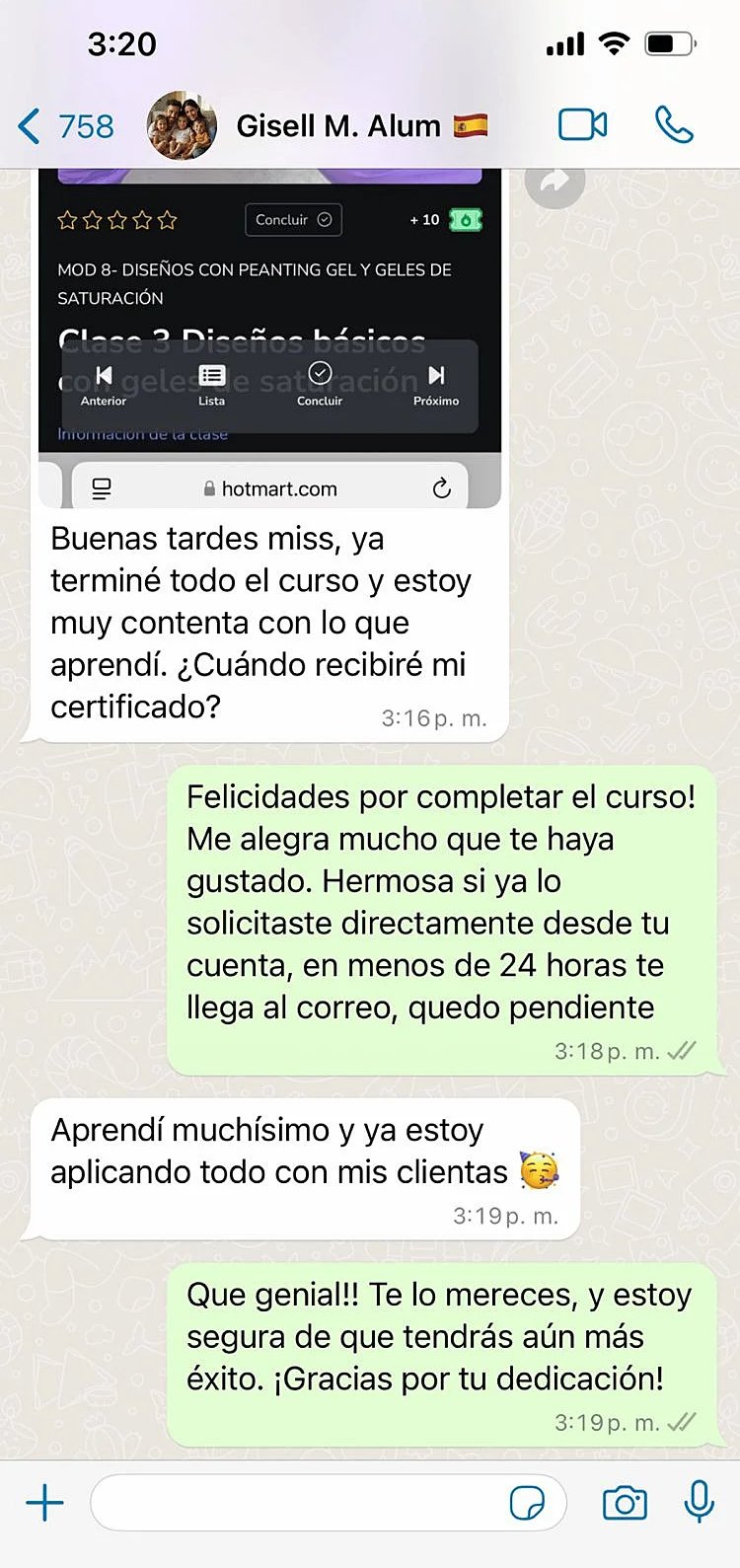 Acceso a un grupo de apoyo donde podrás hacer preguntas, compartir tus avances y recibir consejos personalizados para perfeccionar tus técnicas de decoración de uñas. ¡Crecemos juntas!